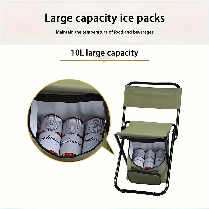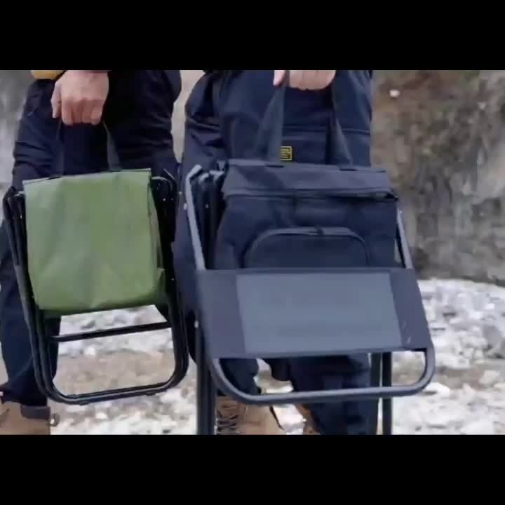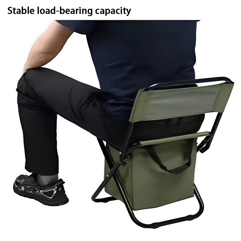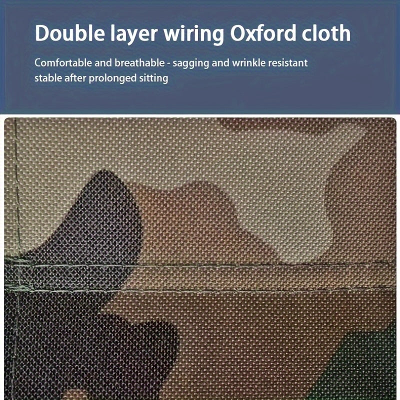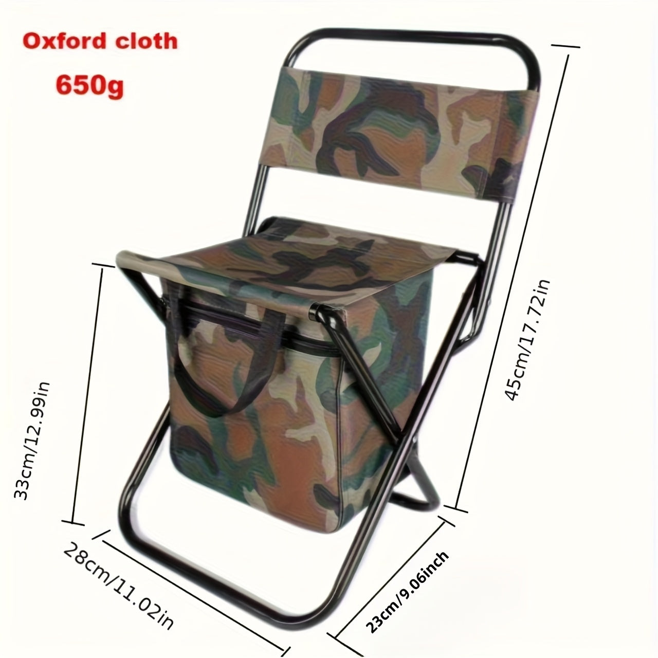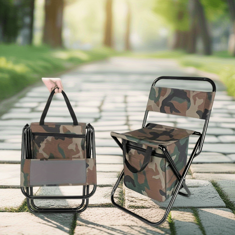 This portable folding chair comes with a built - in cooler bag, featuring a camouflage design, a sturdy steel frame, and an ergonomic handle & backrest. It's lightweight and made of easy - clean material. Recommended for outdoor activities like camping, hunting, beach outings, and fishing. To keep it in good condition, avoid sharp objects and clean it regularly with a damp cloth.